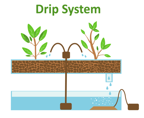 Хранителен разтвор се доставя капка по капка през мрежа от капково маркучче, като излишъкът се връща в резервоара или се изхвърля.