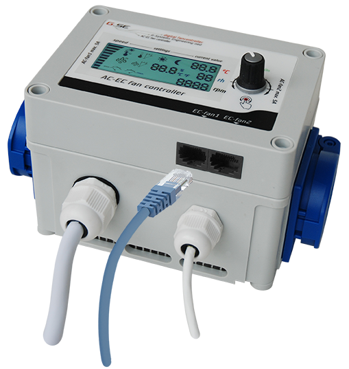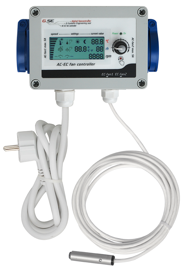This LCD fan controller with built-in display and rotary knob provides very quick and easy setup and reading of all the information provided by the intake and exhaust fan controller. It displays the temperature, humidity and rpm speed of the EC suction fan. A built-in light sensor detects day/night modes. Two 5A / 230V AC outputs for supply and exhaust fan, meanwhile you also have two RJ45 EC outputs and you can choose between 0-10V or PWM signal (pulse duration modulation).
