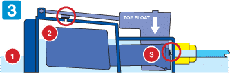 This will in turn allow the ‘inner float’ to rise and shut off the supply (3). The water level is now 20mm.