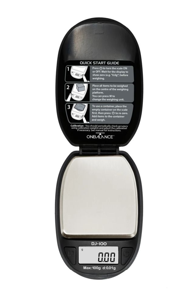 The On Balance DJ-100-RD is a compact jewelry box-shaped digital scale that fits comfortably in the palm of your hand.