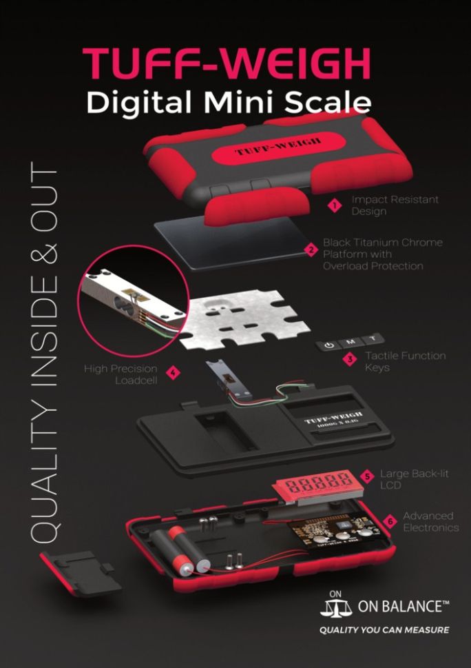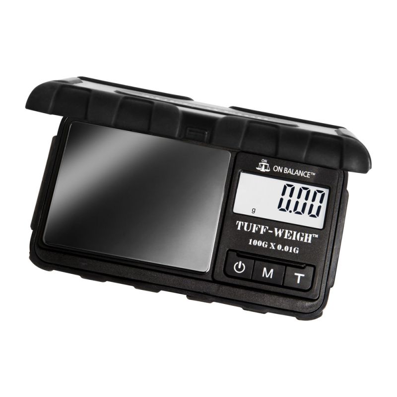 The On Balance Tuff-Weigh Pocket Scale Tuff-100-BK is a rugged pocket scale with an impact-resistant case with a rubber grip and a removable lid that can be used as a pan. The scale has an automatic shutdown function, overload protection and 6 weight measurement modes.