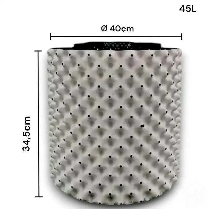 The Root Plus perforated pot is designed to optimize root growth. Its cylindrical shape, together with conical ventilation holes, provides better air circulation and prevents root entanglement .