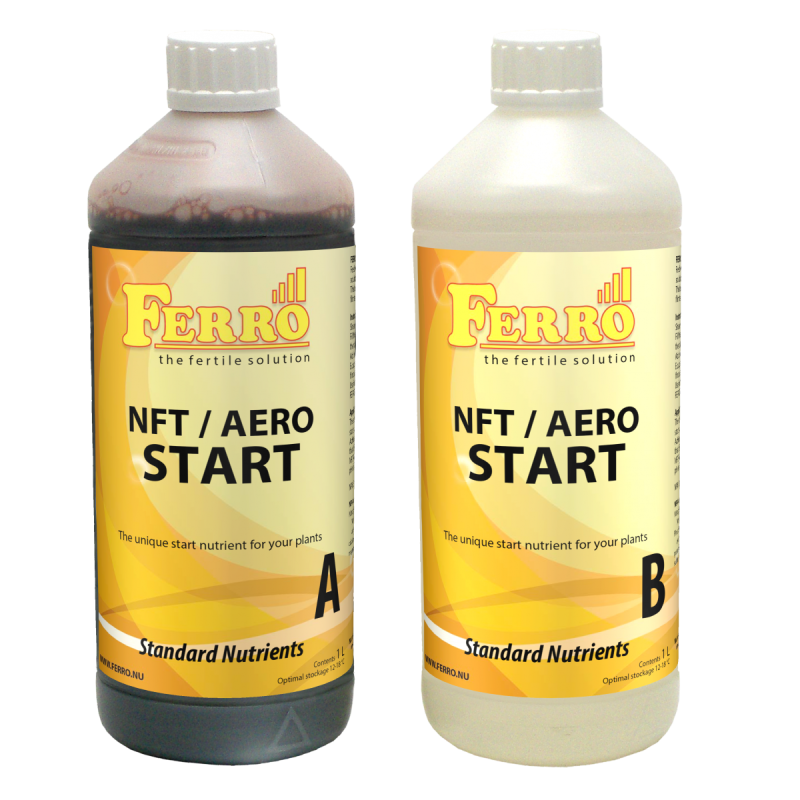 Ferro NFT / AERO START A&B 2x1л. е пълноценен двукомпонентен тор за първоначално подхранване на млади растения, които се отглеждат в NFT / AERO (известни също като рециркулационни системи), така наречените мехурчести (bubbleponics) системи или DWC (deep water culture) системи. При отглеждане с NFT / AERO системи е изключително важно да се поддържа рН в средата (вода / въздух) на стабилно ниво между оптималните стойности от 5.0 и 6.0. Генерирането на мехурчета (чрез използване на аератори в хранителния разтвор) и впръскването на хранителни разтвори в тръби или по други начини също могат да се считат за NFT / AERO системи.