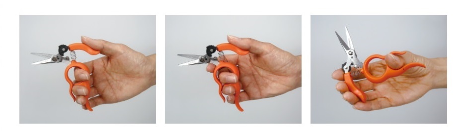Фигура 2. (от ляво на дясно): Захват за малки ръце. Събиране на цветове, прищипване, рязане на ягодови издънки, рязане на конци и други. За да избегнете нараняване, показалецът трябва да държи дръжката.