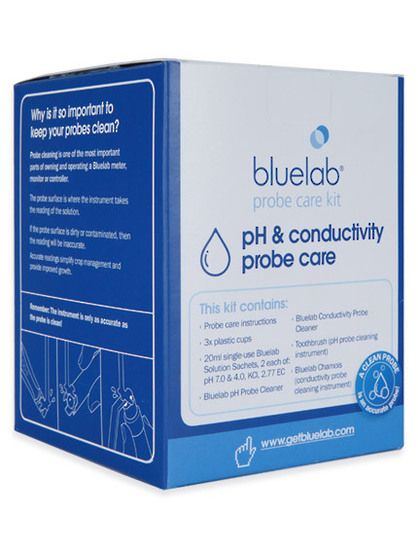 Bluelab Probe Care Kit – pH & Conductivity е комплект, съдържащ всичко необходимо за почистване, хидратиране и калибриране на сондата на вашия pH метър, както и за почистване и тестване на сондата на вашия EC метър (уред за измерване на електропроводимостта):