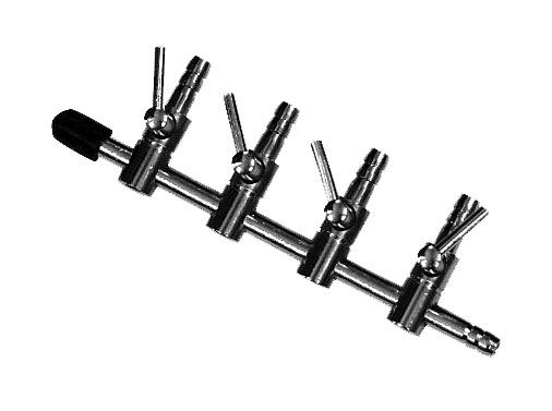 Разклонител за въздух и вода с 4 изхода от висококачествен хромиран месинг. Входът е 4 мм, а колекторът има 4 крана, всички със собствени спирателни вентили.