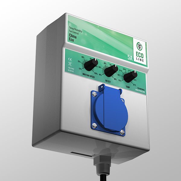 TechGrow Clima Eco 5A (Temp-RH) контролира минималната скорост на вашия вентилатор до достигане или поддържане на желаната температура и относителна влажност в помещението за отглеждане. Този бюджетен контролер е лесен за управление - има само три въртящи се копчета - за настройване на минималната скорост на вентилатора, за стойността на относителната влажност, както и за желаната стайна температура.
