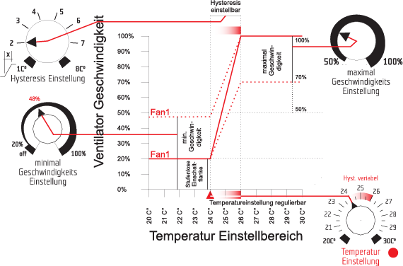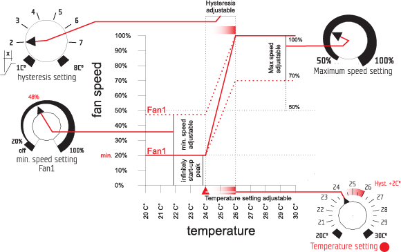 Той може лесно да се контролира, като се регулират желаната от вас минимална, максимална скорост и хистерезис с четири копчета.