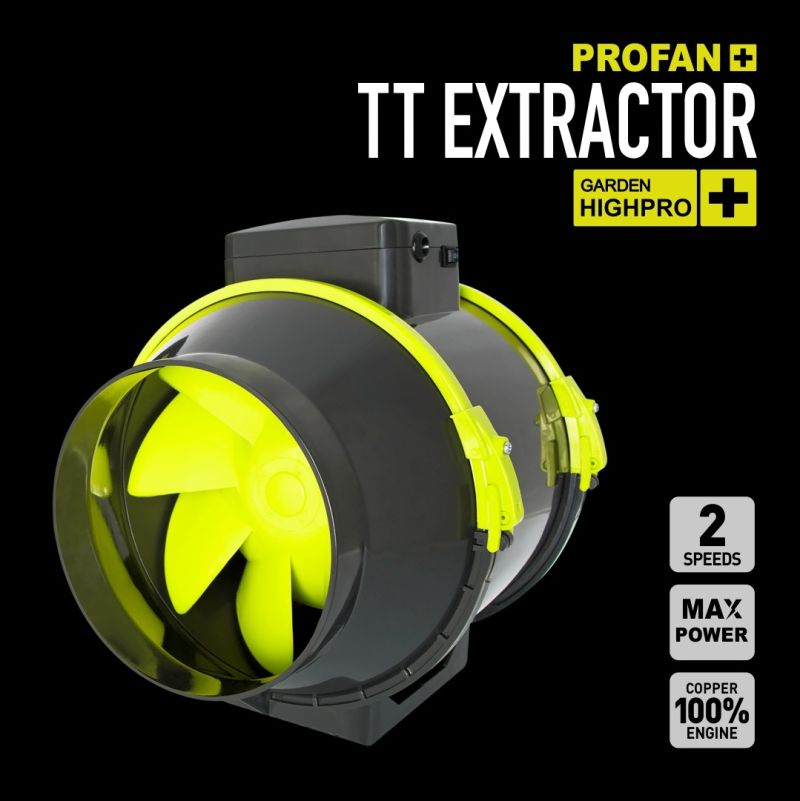 Garden Highpro PROFAN TT EXTRACTOR FAN 150 е вентилатор с две скорости и 100% меден двигател (за по-голяма ефективност). Скобите в корпуса му позволяват лесно да бъде свален (за почистване или смяна на посоката на въздушния поток), без да се налага да откачате въздуховодите.