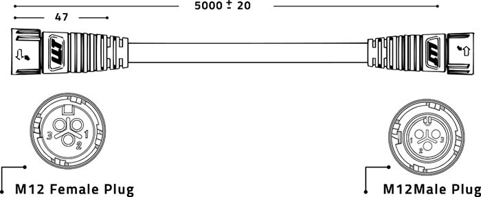 Инструкции за употреба: Просто свържете самозаключващия се M12 мъжки щекер към структурния изход Signal Out и самозаключващия се M12 женски щекер към структурния вход Signal In на следващото осветително тяло.