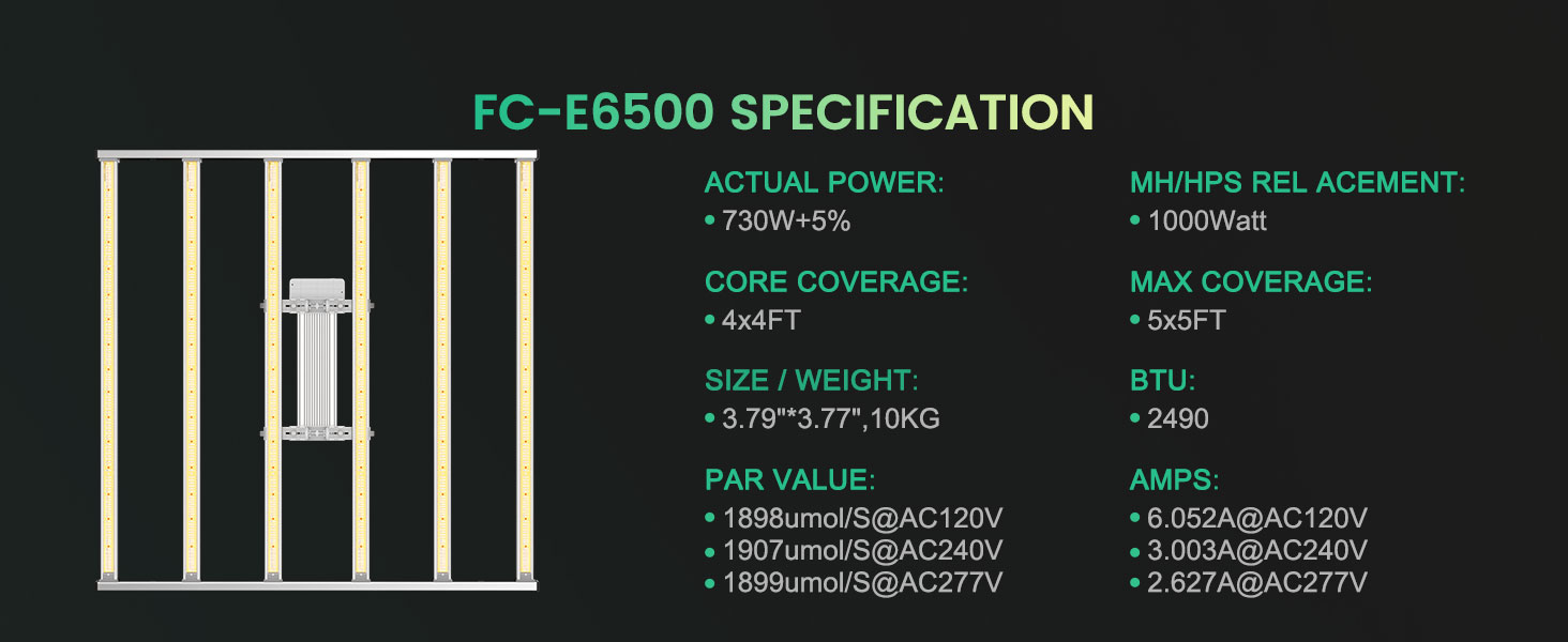 - Високоефективна LED лампа за отглеждане: Светодиодната лампа за отглеждане FC-E 6500 използва висококачествени диоди BridgeLux, постигайки водеща в индустрията ефикасност от 2.8 µmol/J и максимален добив от 2.5 грама на ват. С 30% по-висок среден PPFD в сравнение с други осветителни тела за отглеждане със същата мощност, той осигурява по-добро качество на реколтата и рентабилност, което води до 50% намаление на сметките за електричество в сравнение с HID / HPS (натриевите) лампи.