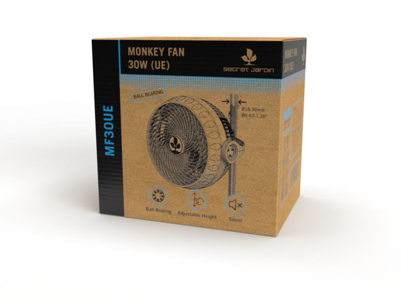 Secret Jardin Monkey Fan 30W е вентилатор с щипка, съвместим с всички палатки за отглеждане на пазара. Оборудван със сачмен лагер, което го прави идеалното решение за циркулация на въздуха във вашата палатка. Вентилаторът се предлага с три крепежни елемента за монтиране на тръби с диаметър от 16мм до 30мм.