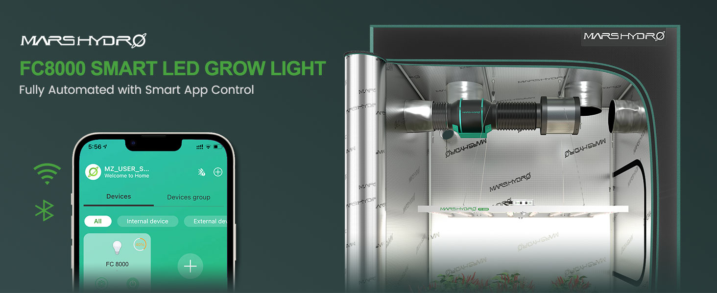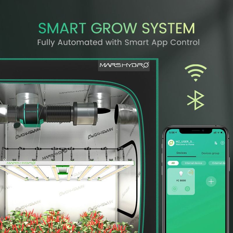 Mars Hydro Smart FC 8000 Samsung LM301B 800W LED Grow Light е пълен комплект диодно осветление за отглеждане на растения в домашни условия (палатка). Smart FC 8000 предлага възможност за контрол чрез приложението Mars Hydro APP през мобилен телефон или Wi-Fi, включващ планиране на растежа, авто-затъмняване, синхронизиране и програмиране на план за отглеждане, подходящ за търговско отглеждане в големи мащаби или висококачествено отглеждане у дома. Smart FC 8000 осигурява равномерно светлинно излъчване от 1500 μmol/м²/с, достатъчно за активиране на 100% фотосинтеза и получаване на максимален добив при различни концентрации на CO2.