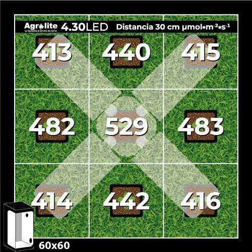 Agrolite 4.30 LED представлява иновативен осветителен продукт с четири регулируеми панела от по 30W всеки, като общата му мощност достига 120W. Геометрията на лампата, високата ѝ ефективност и ниското отделяне на топлина я превръщат в идеалното осветително тяло за етапите на покълване, растеж и цъфтеж.