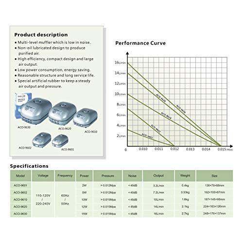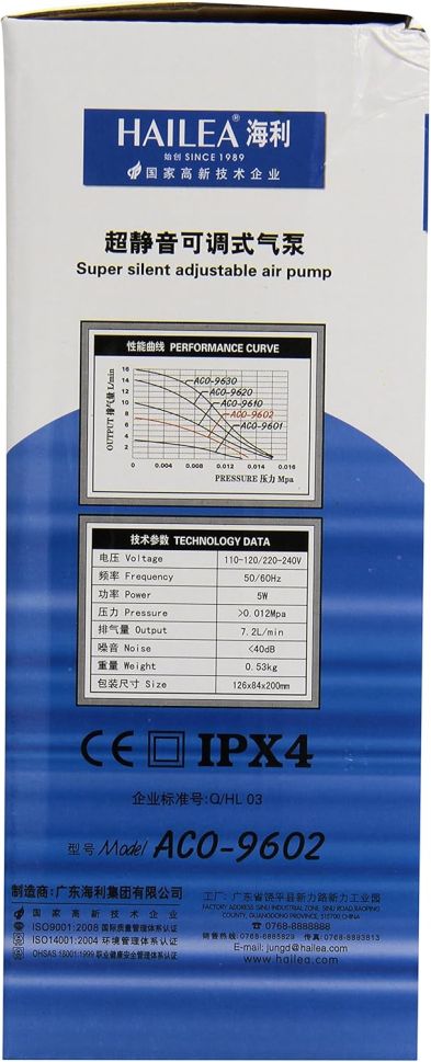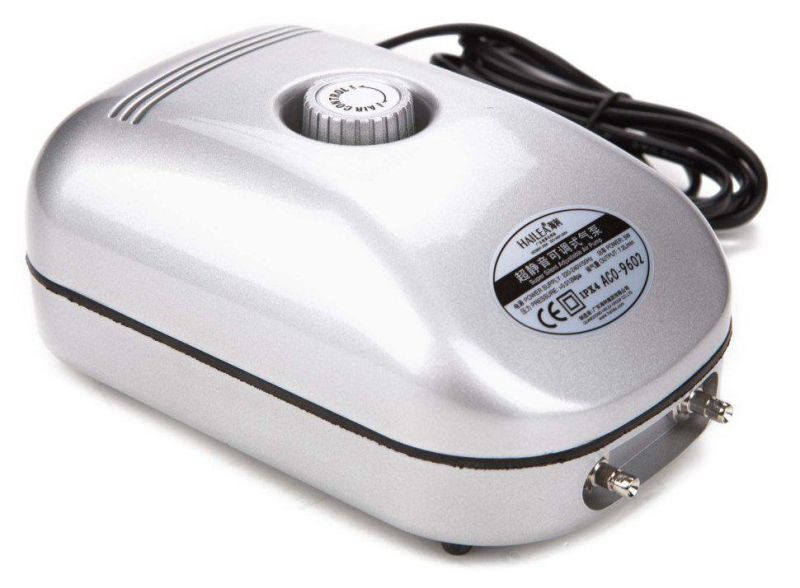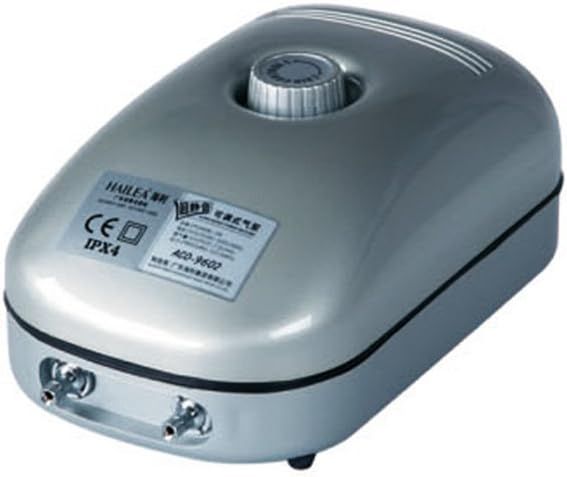 Hailea ACO-9602 предлага добър баланс между размер, мощност и производителност: 7,2 L/min дебит, регулируем поток, ниско ниво на шум и двойни изходи правят модела подходящ за множество системи с аериране — от аквариуми до хидропоника.