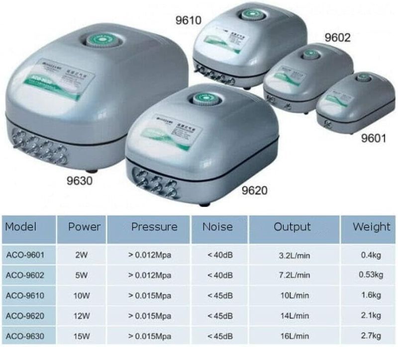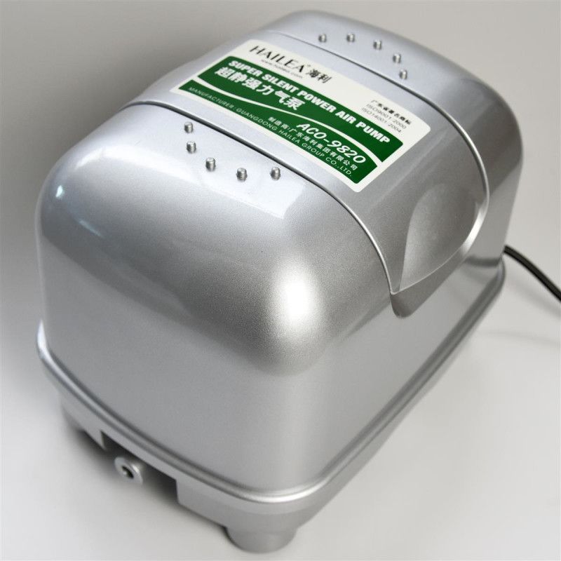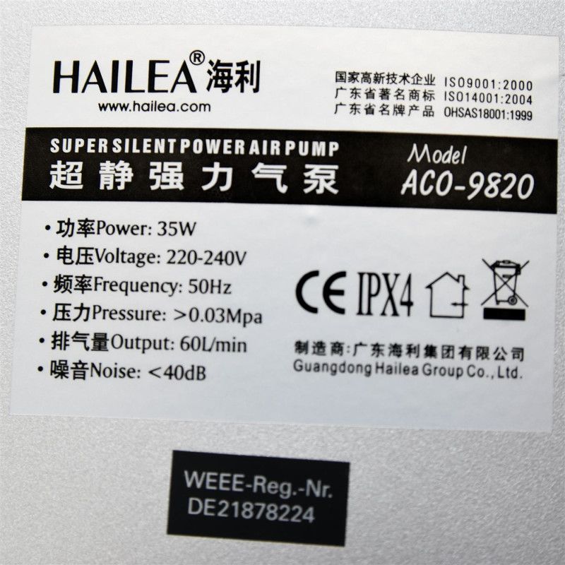 - Модел: ACO-9820 — серия въздушни помпи Hailea с висок дебит и тиха работа.