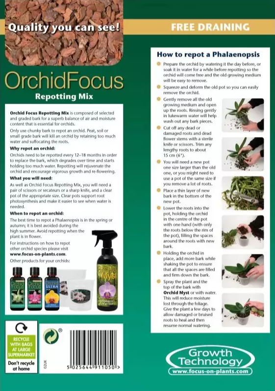 - Използвайте само кора за пресаждане на орхидеи! Торф, почва или много дребна кора ще убият орхидеята, като задържат твърде много вода и задушават корените.