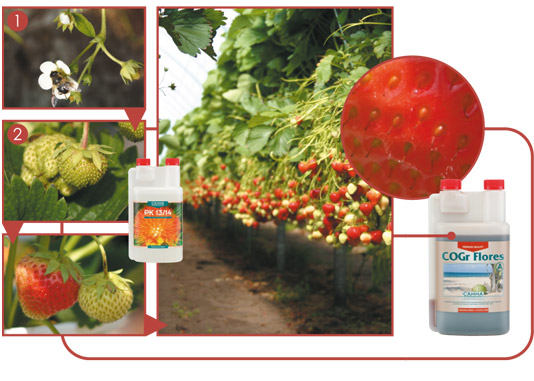 - По време на цъфтежа растението се нуждае от повече фосфор и калий, които може да се предоставят, като добавите CANNA PK 13/14 в продължение на една седмица, но 3 седмици преди беритбата. Резултат: допълнителен добив. Моля вж. (2).